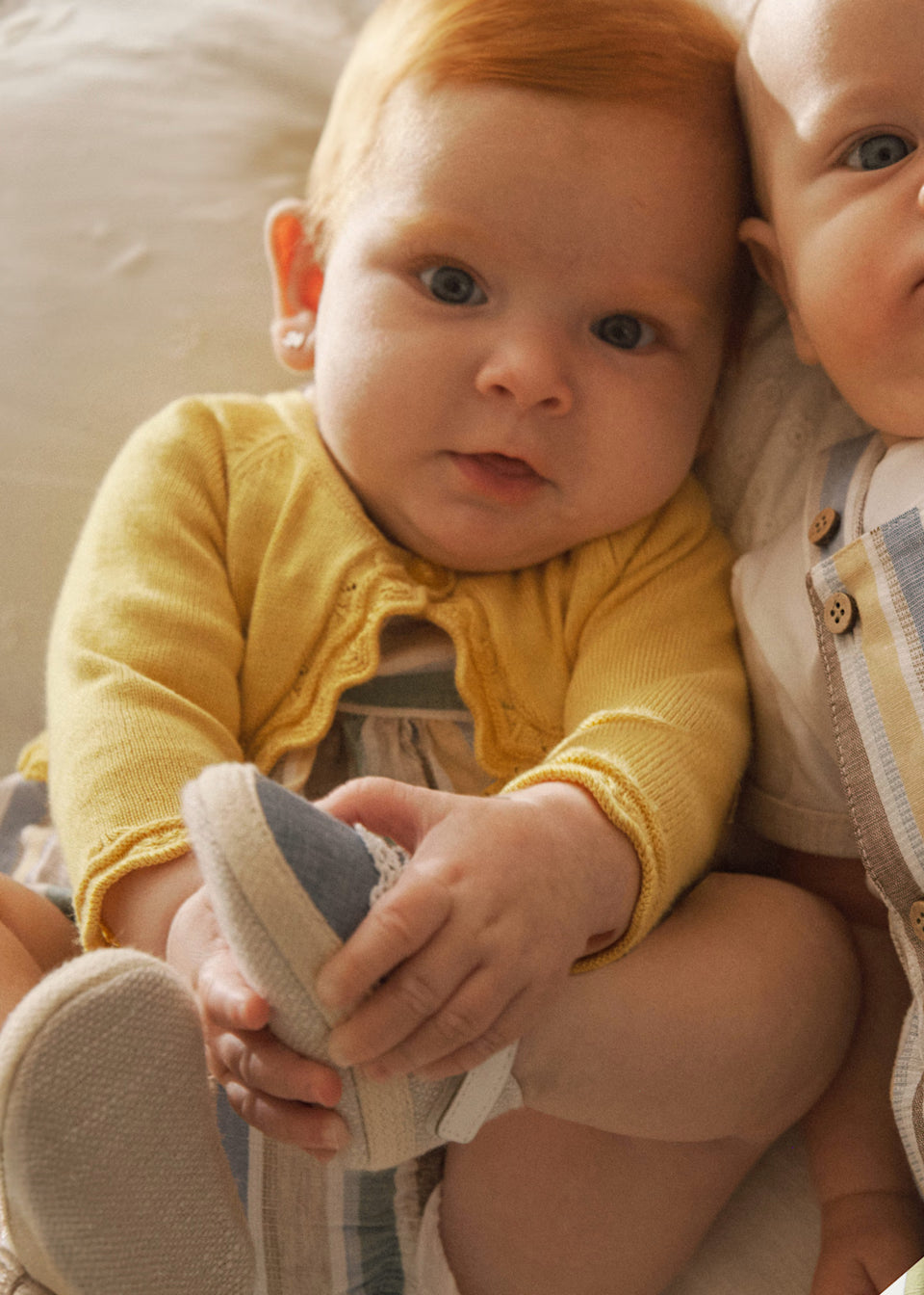Rebeca de manga ranglán para recién nacida. Cierre con un único botón. Tejido de punto tricotosa de tacto suave y agradable. Elementos de adorno: motivos calados, detalles de ondas.