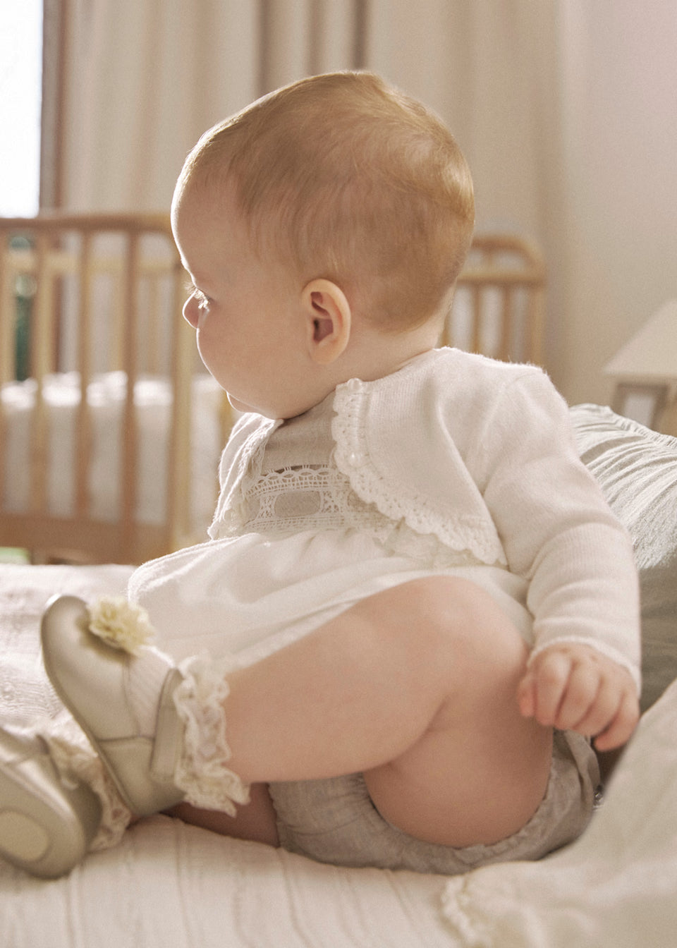 Rebeca de manga larga para niña. Cuello redondo. Cierre con botones en la parte delantera. Tejido de punto tricotosa de tacto suave y agradable. Elementos de adorno: motivos calados, encajes.