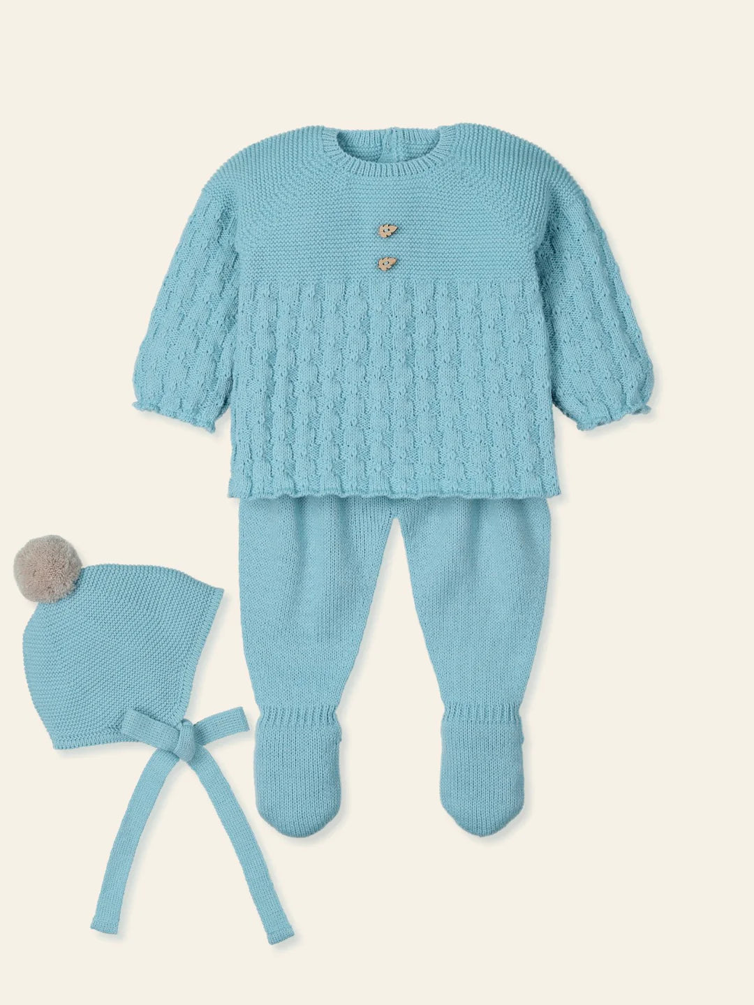 Conjunto de 3 piezas en color aqua para recien nacido. Suéter, pantalón y gorrito a juego. El suéter tiene cierre tracero con botones para facilitar la puesta. Detalle de hojitas en suéter y pompon beige en el gorrito, suave al tacto.