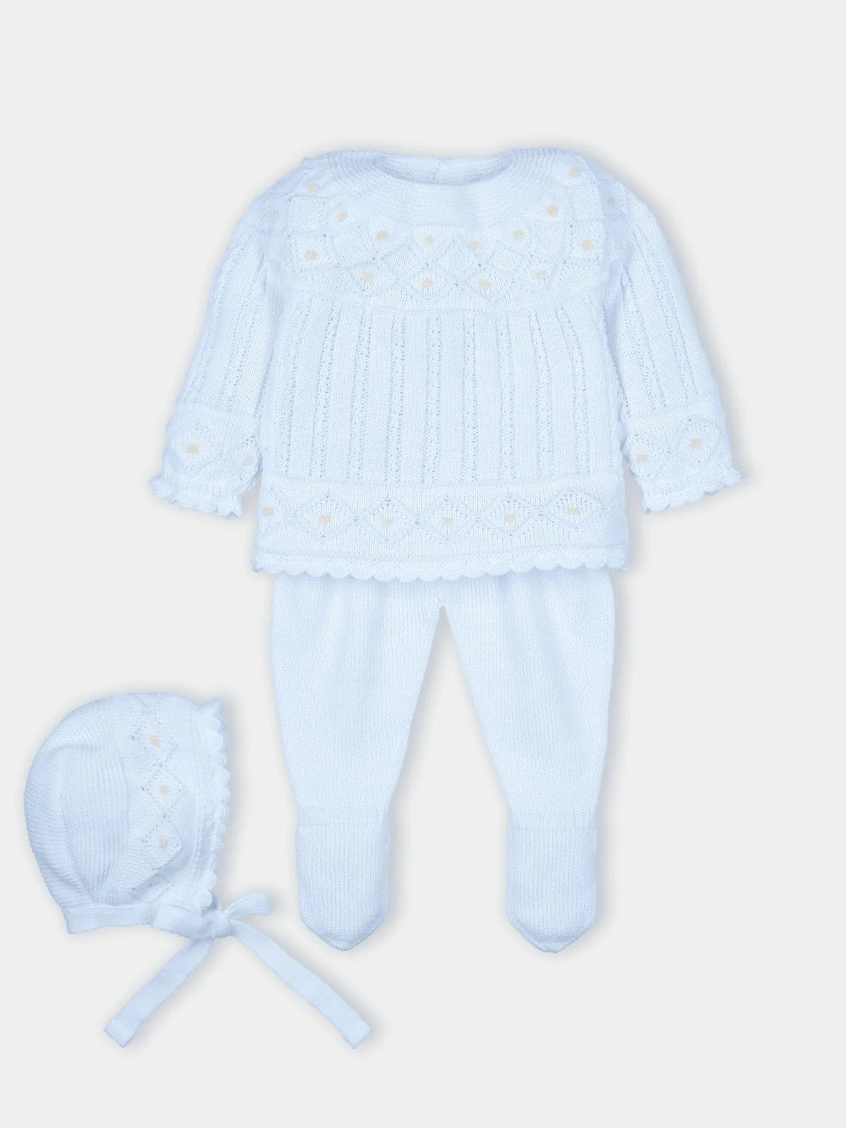 Set de 3 piezas para recien nacida compuesto de suéter, pantalón y gorrito.