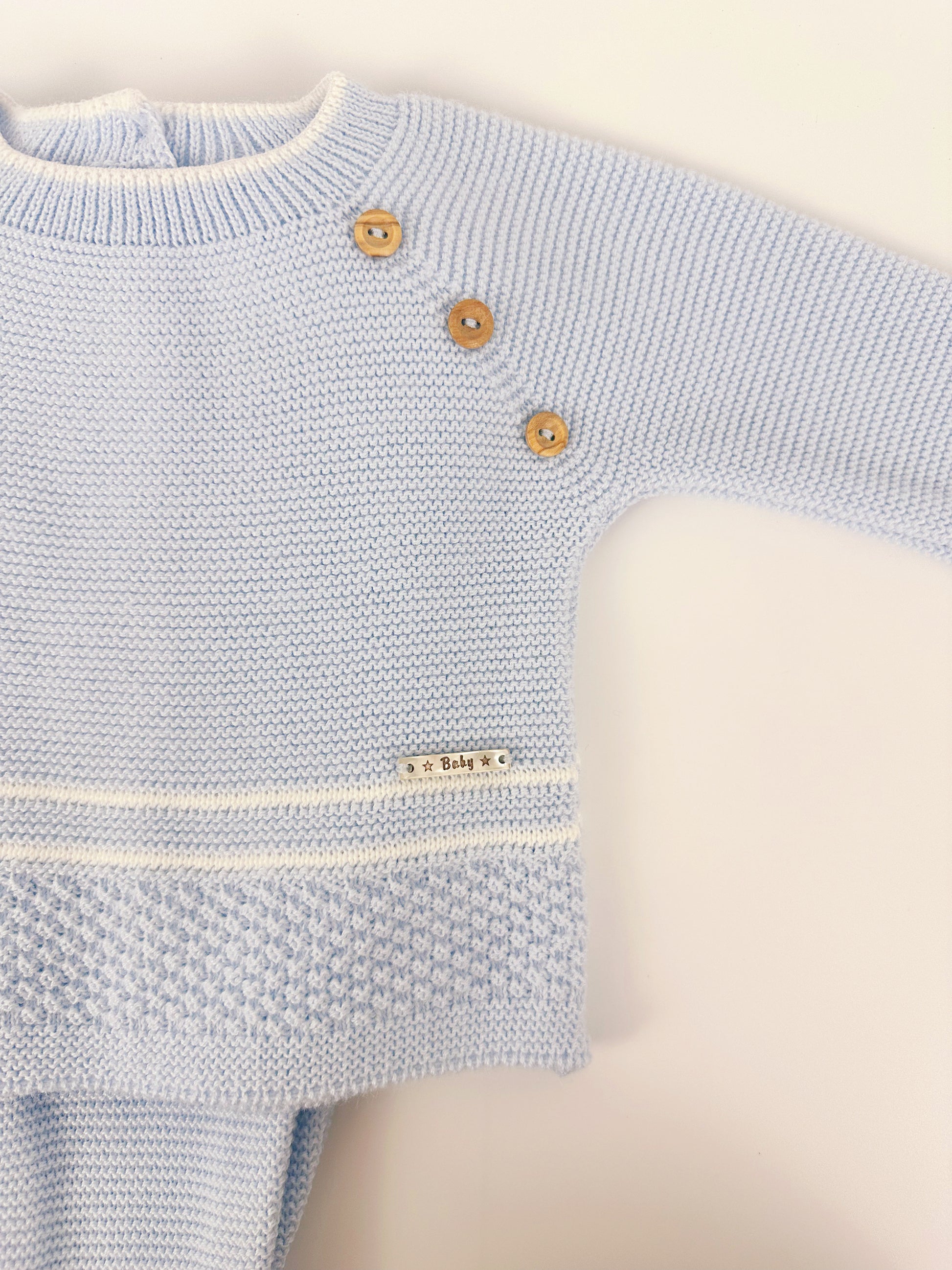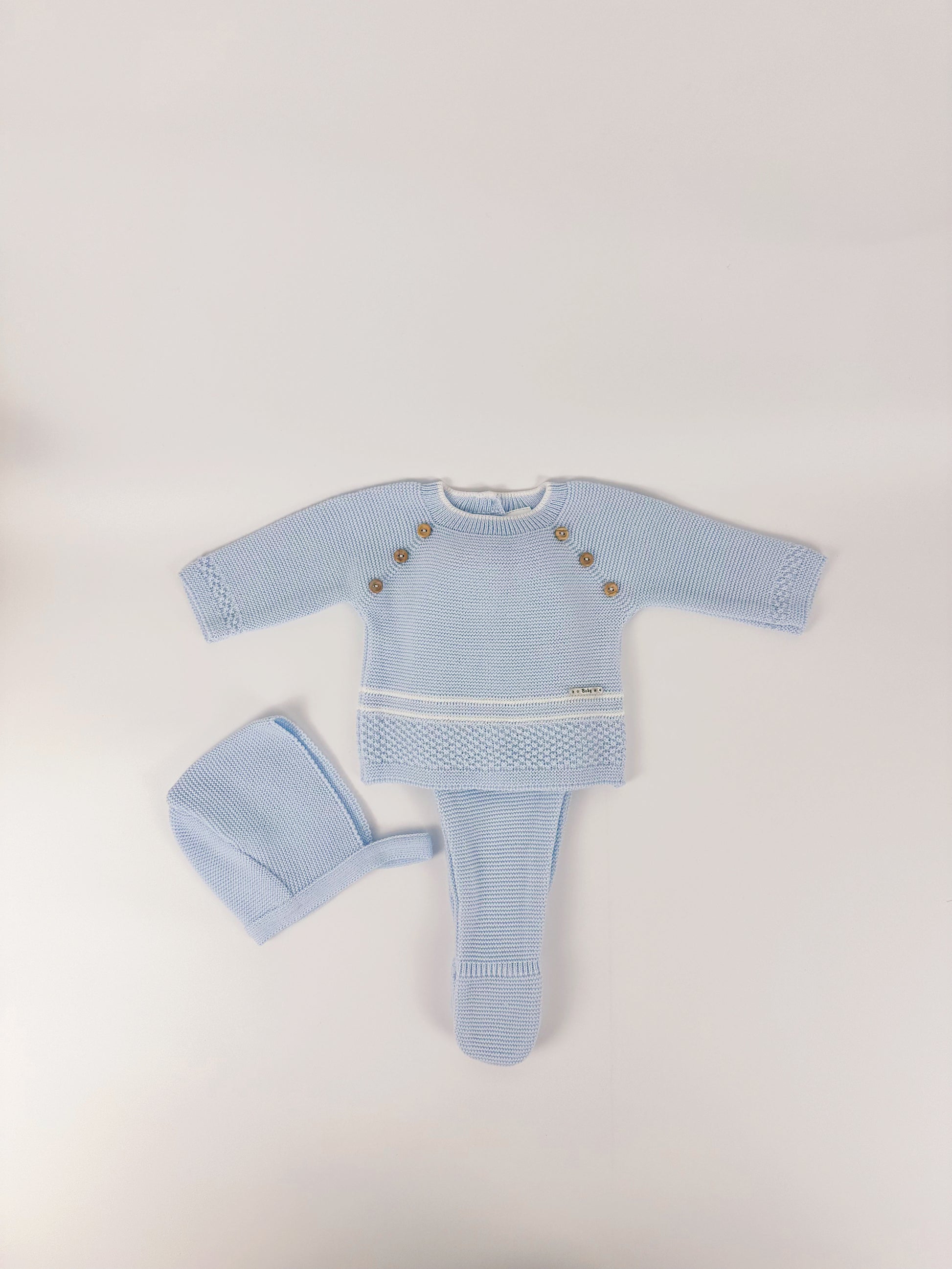 Conjunto de 3 piezas en color celeste para recien nacido. Suéter, pantalón y gorrito a juego. El suéter tiene cierre tracero con botones para facilitar la puesta.