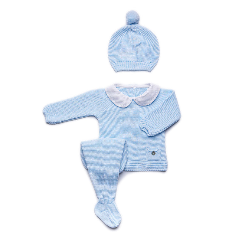 Set de 3 piezas para recien nacida compuesto de suéter, pantalón y gorrito.