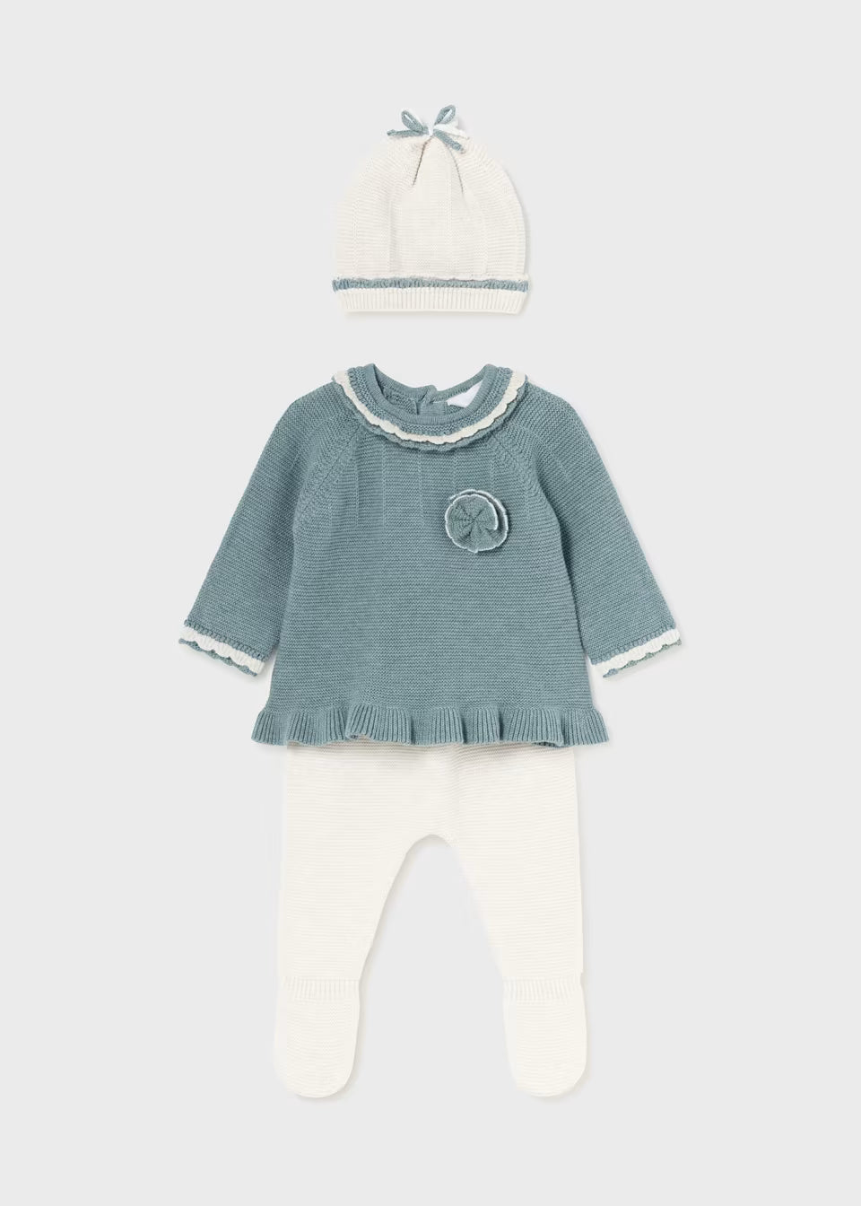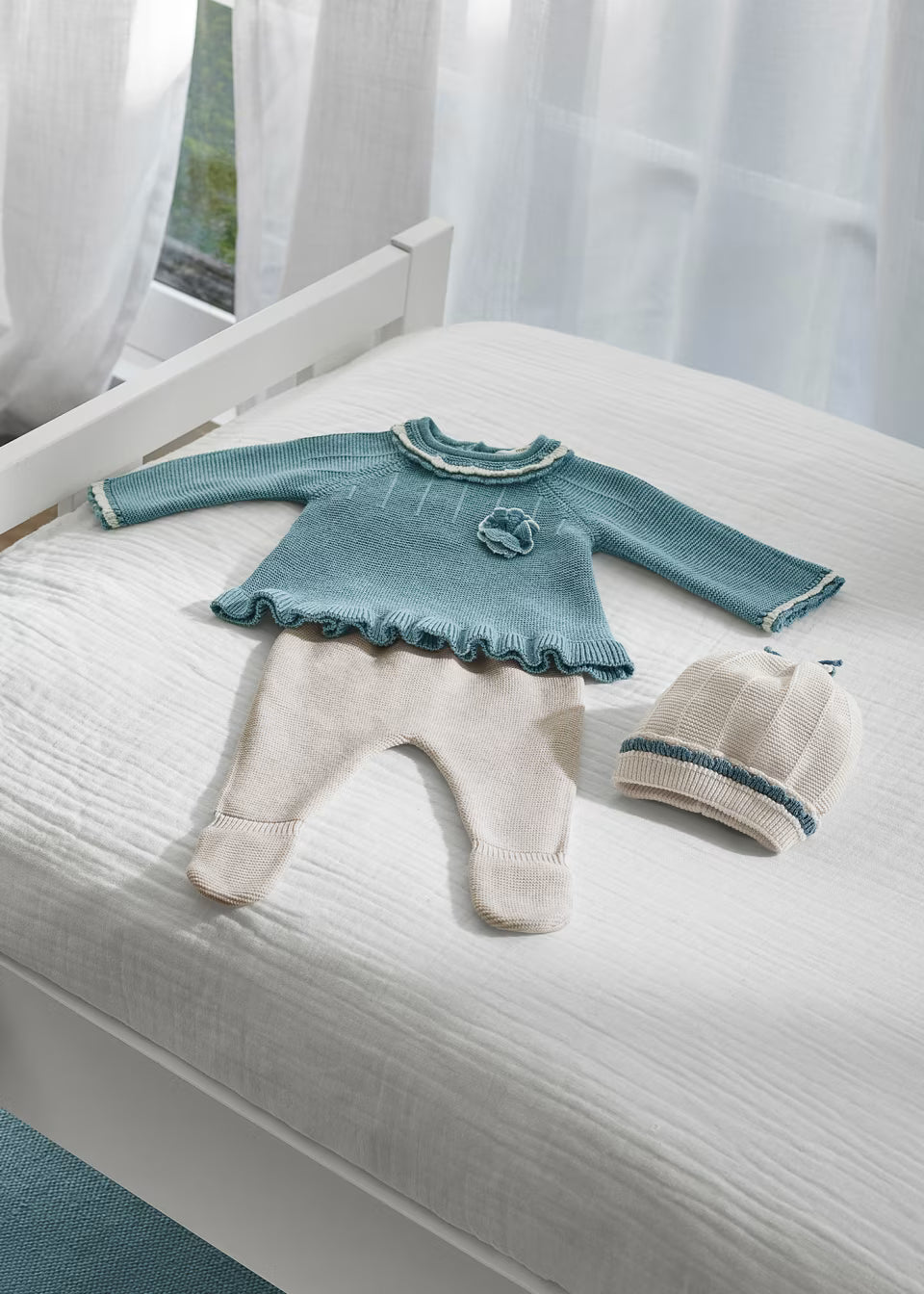 Conjunto tricot de 3 piezas compuesto por suéter, pantalón y gorrito a juego. El suéter tiene cierre tracero con botones para facilitar la puesta.
