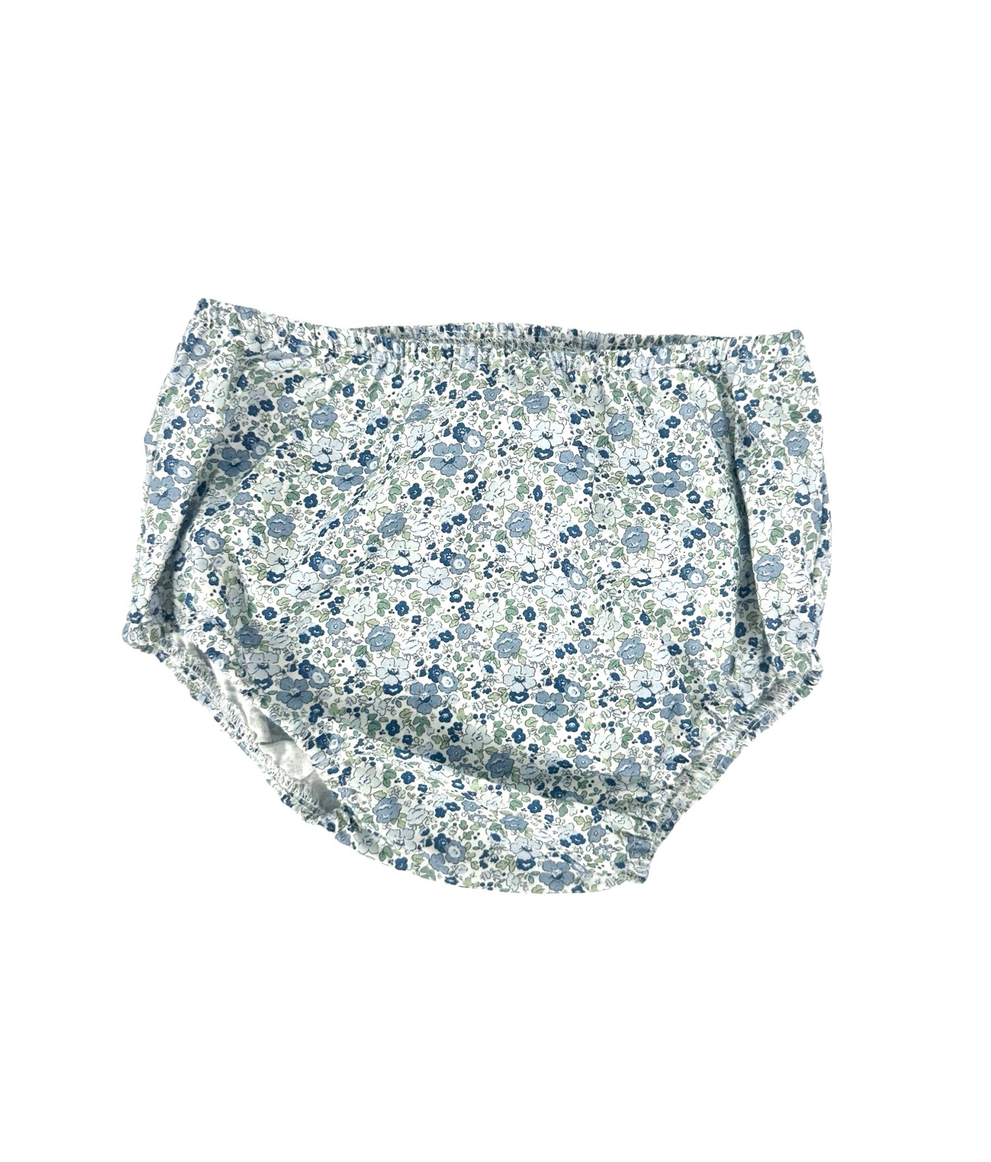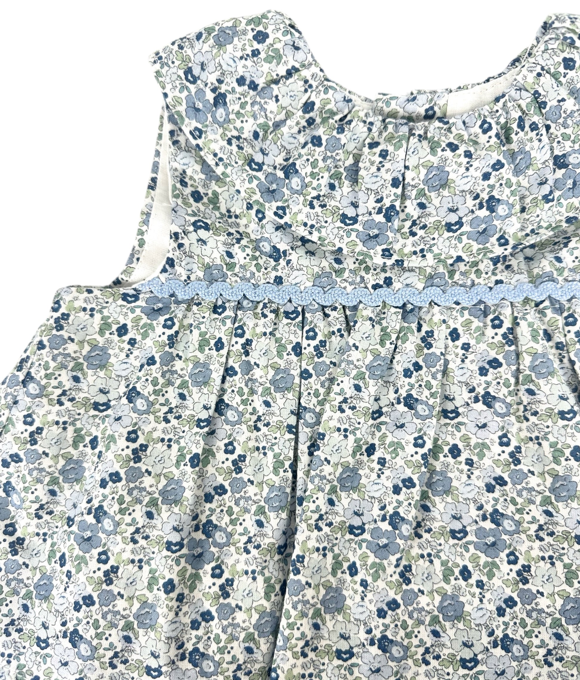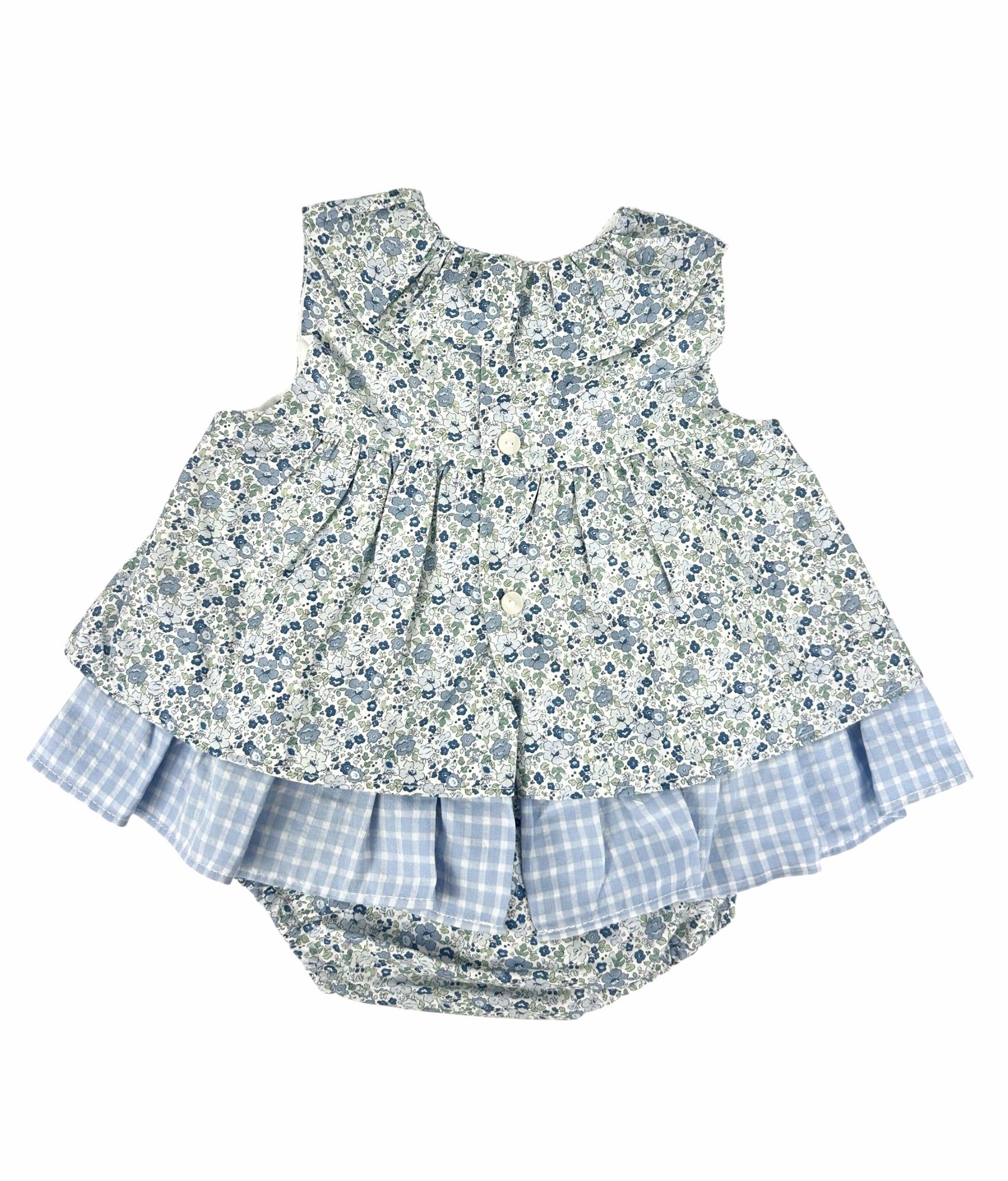 Vestido color celeste empolvado, confeccionado con un bonito estampado floral combinado con detalles en cuadros. Tiene botones en la espalda. Viene con cubrepañal