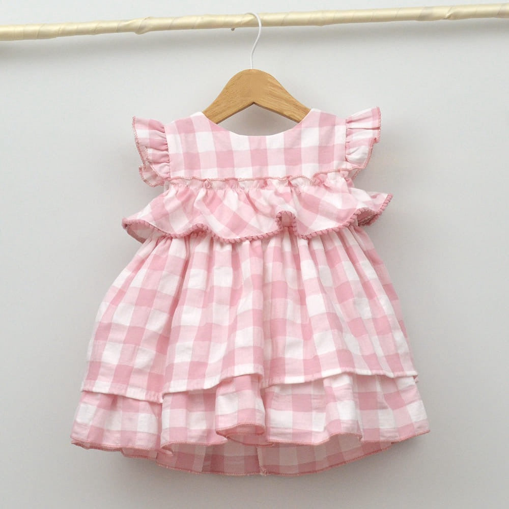 Vestido estampado a cuadros con detalles de vuelos en cintura y falda.