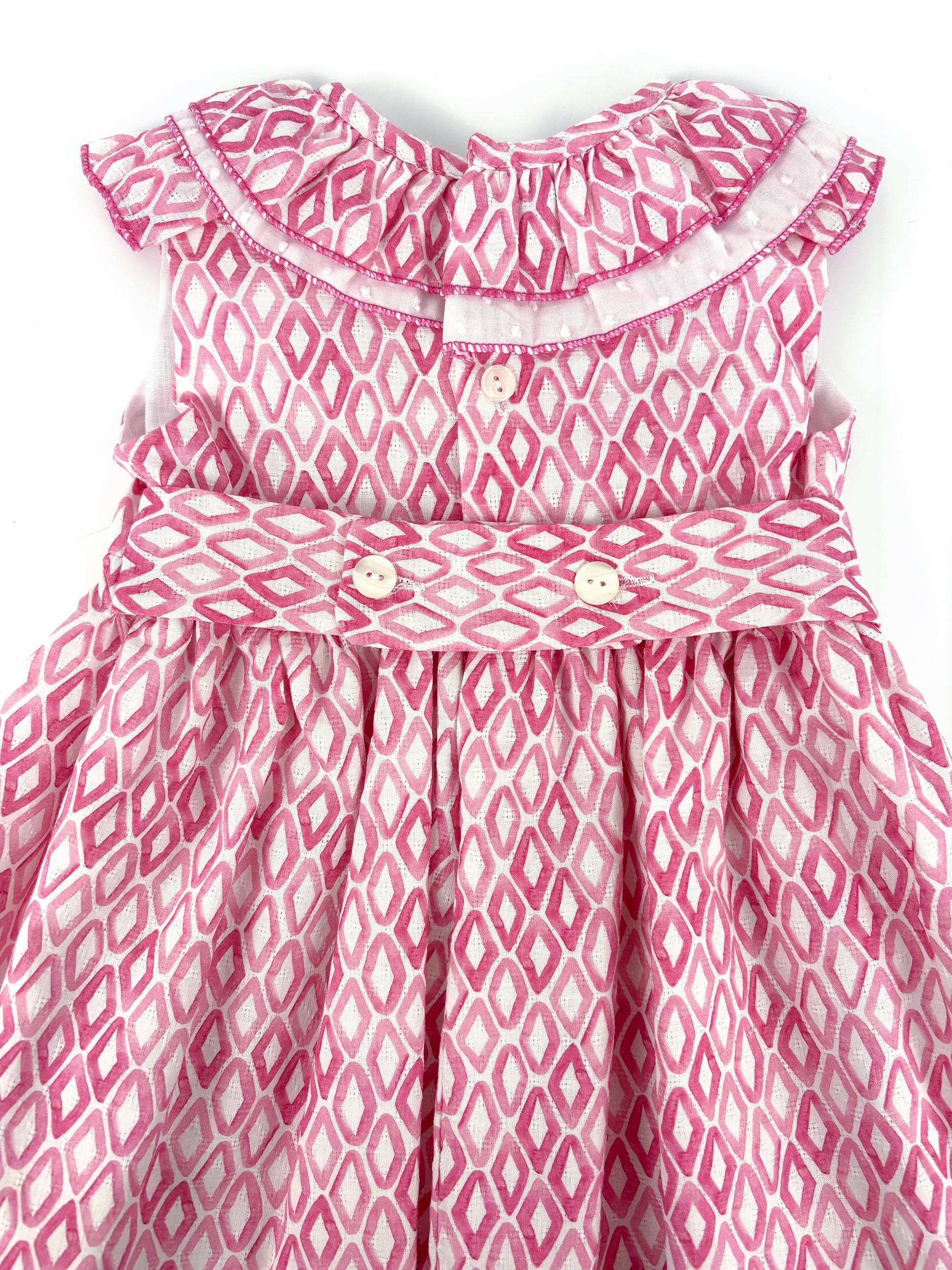 Vestido rosado con estampado geometrico. Detalle en cuello y cintura.